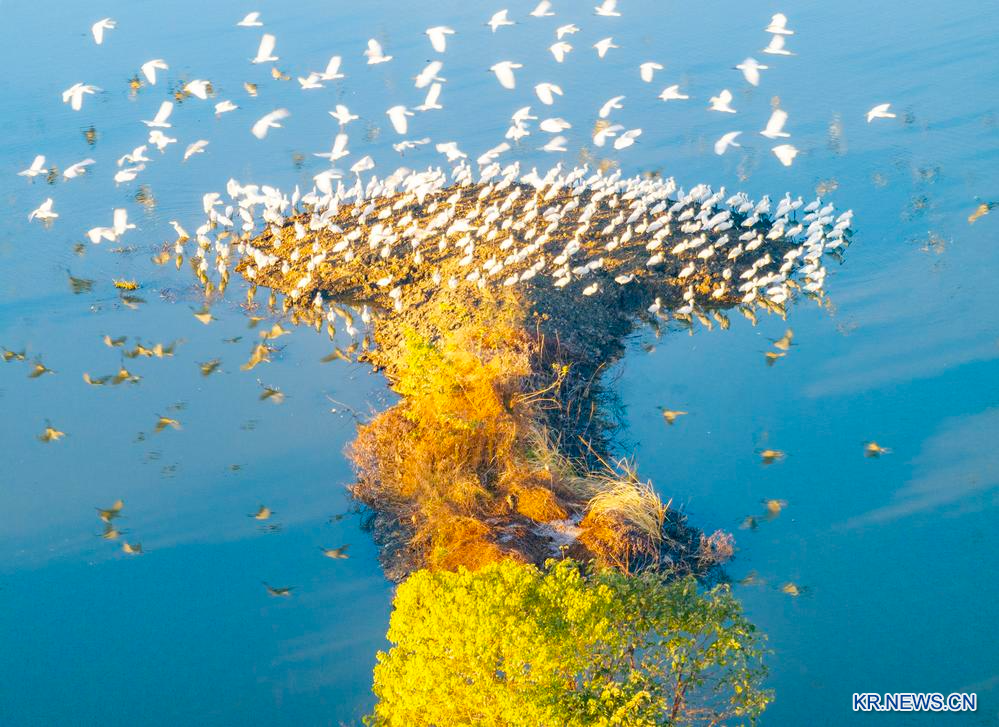 지난 6일 드론으로 촬영한 장쑤(江蘇)성 싱화(興化)시 리샤허(里下河) 국가습지공원에 몰려든 새 무리. 2025.12.8