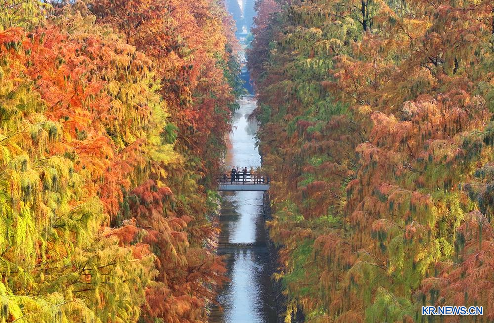 후난(湖南)성 헝양(衡陽)시 룽차오(隆橋)촌의 메타세쿼이아 숲을 걷는 관광객을 10일 드론으로 내려다봤다. 2025.12.10