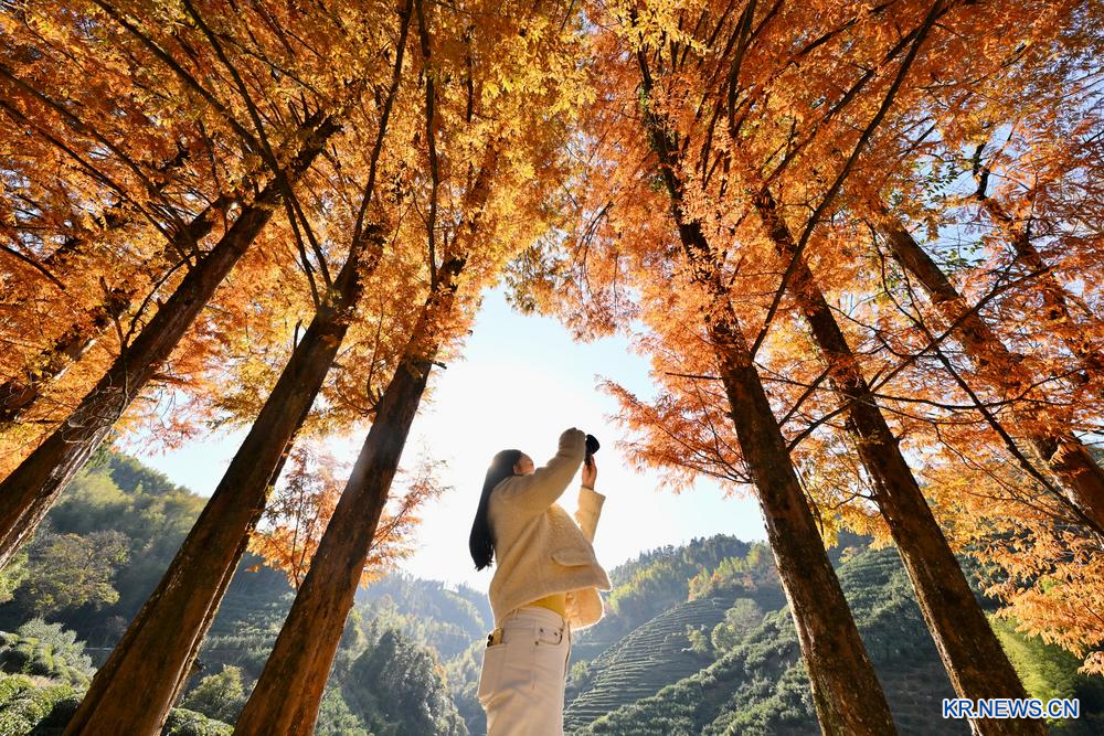 지난 1일 관광객이 푸젠(福建)성 우이(武夷)산 인근의 삼나무 숲 풍경을 촬영하고 있다. 2025.12.2