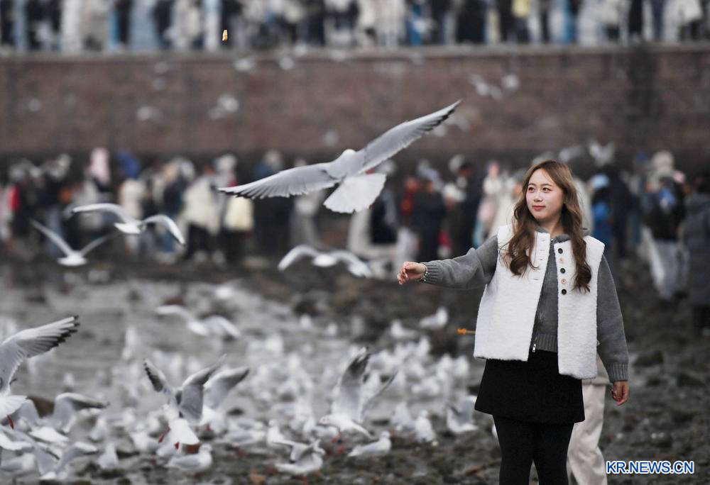 13일 잔차오 관광지에서 갈매기를 구경하고 있는 시민과 여행객들. 2025.12.14