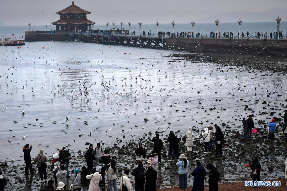 [신화망 칭다오 12월15일] 겨울이 되자 산둥(山東)성 칭다오(靑島)시 잔차오(棧橋) 관광지에 많은 갈매기가 날아들며 장관이 연출됐다.