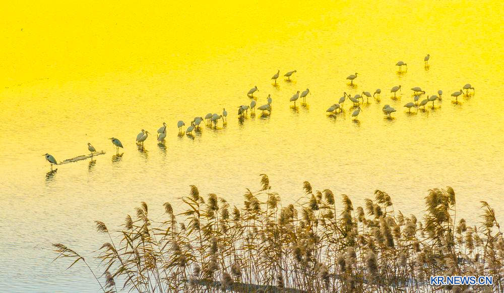 [신화망 베이징 12월16일] 월동을 위해 날아온 철새들이 아름다운 겨울 풍경을 연출하고 있다. 15일 장쑤(江蘇)성 싱화(興化)시 리샤허(里下河)국가습지공원에 머물고 있는 새 떼의 모습을 드론 사진에 담았다. 2025.12.15