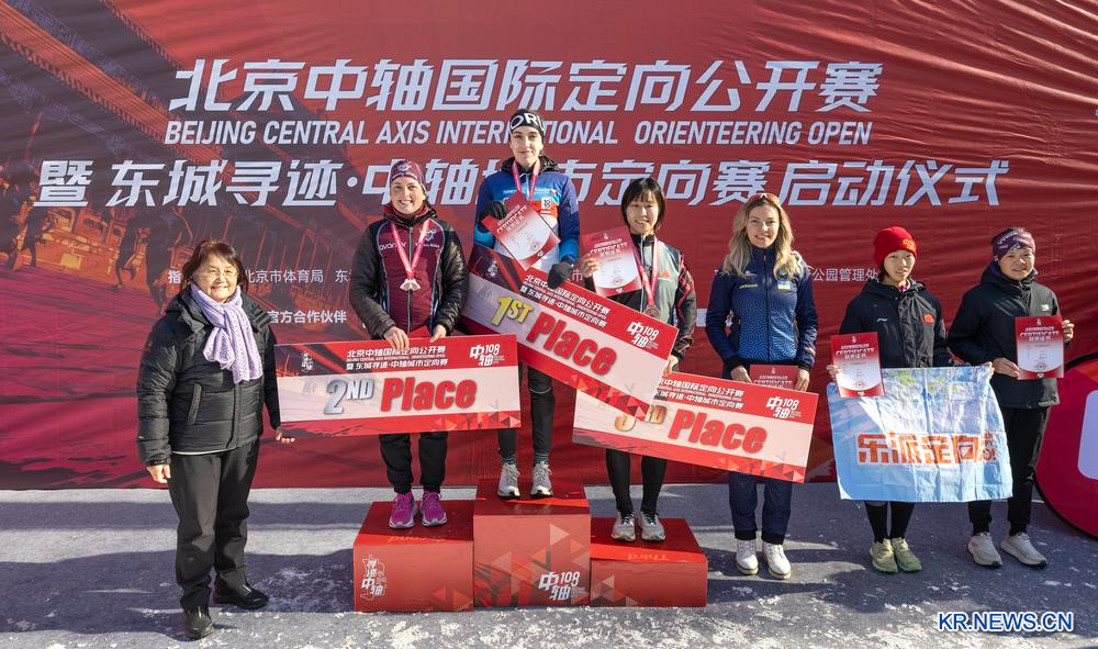 이날 '제1회 베이징 중축 국제 오리엔티어링 오픈 대회' 엘리트 여자 부문에서 1~6위를 차지한 선수들이 시상대에 올라 기념사진을 찍고 있다. 2025.12.14
