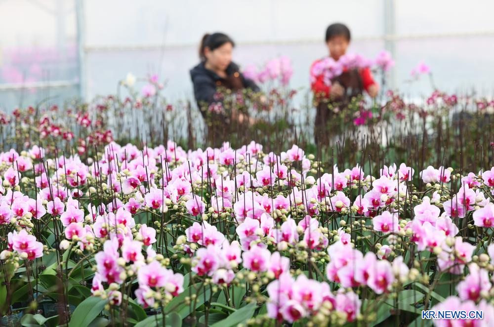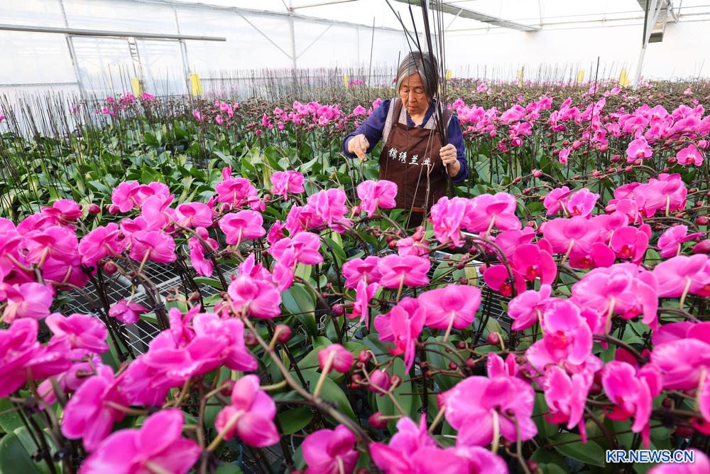 17일 허베이(河北)성 스자좡(石家莊)시의 한 화훼 재배 기지에서 호접란의 상태를 확인하고 있는 직원.