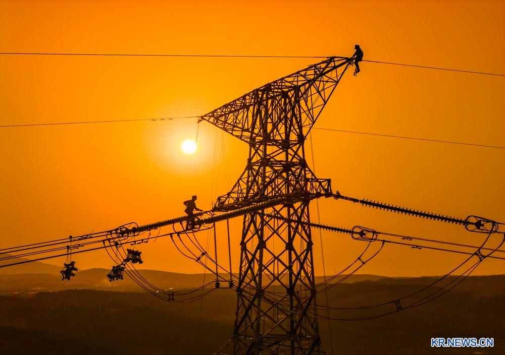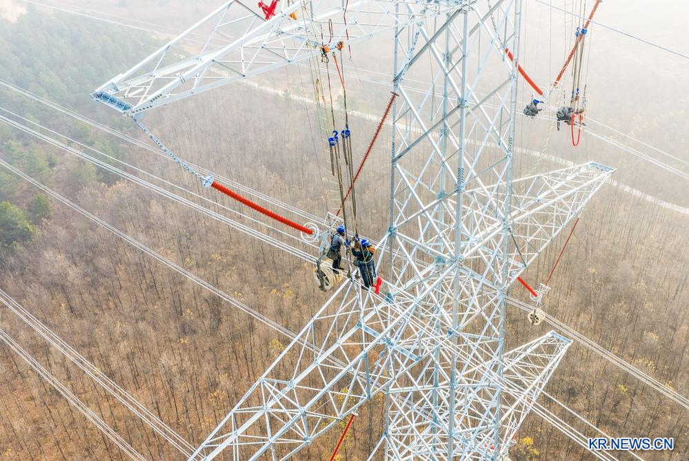 이날 샹젠~루다오의 500㎸ 선로 공사 현장에서 작업 중인 직원을 드론에 담았다. 2025.12.17