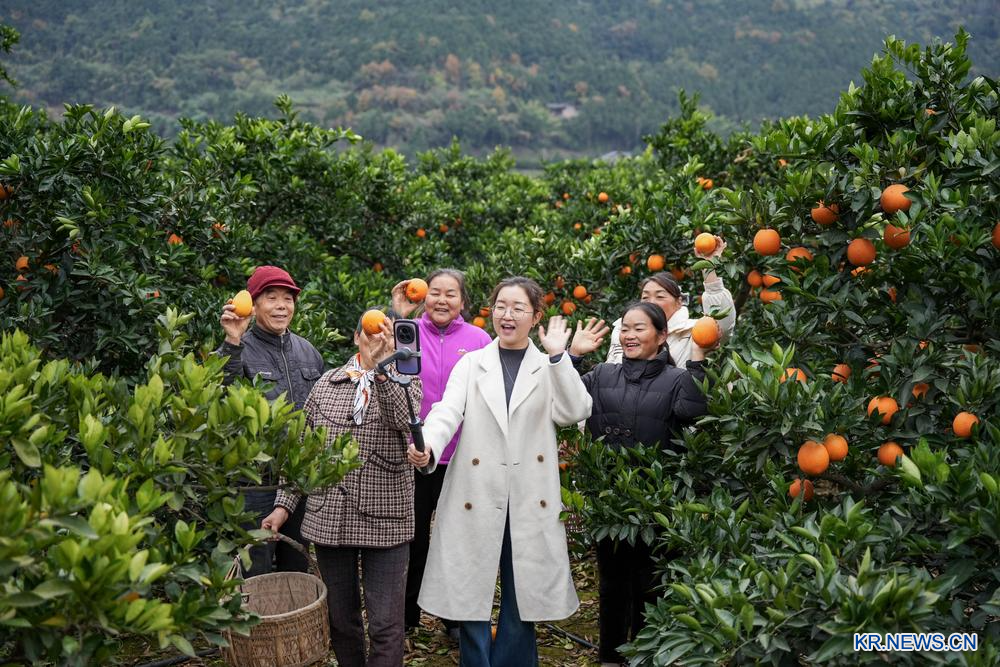 지난 12일 창시현 링장(陵江)진 촌간부(오른쪽 셋째)가 마을 주민들과 함께 과수원에서 라이브 방송을 진행하며 감귤을 판매하고 있다. 2025.12.19