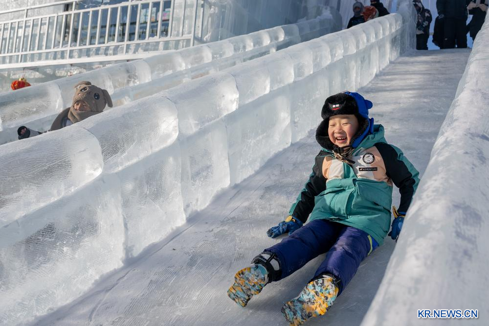 21일 빙설 나다무(那達慕) 행사장에서 얼음 미끄럼틀 타는 어린이.