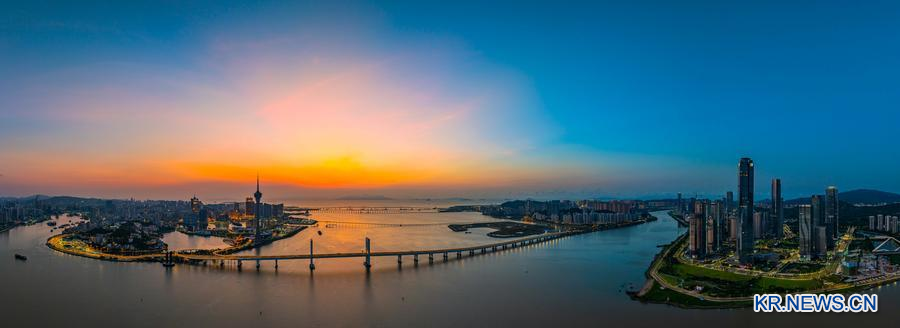 지난해 8월 8일 마카오와 헝친(橫琴)의 경관을 드론 파노라마 사진에 담았다. (사진/신화통신)