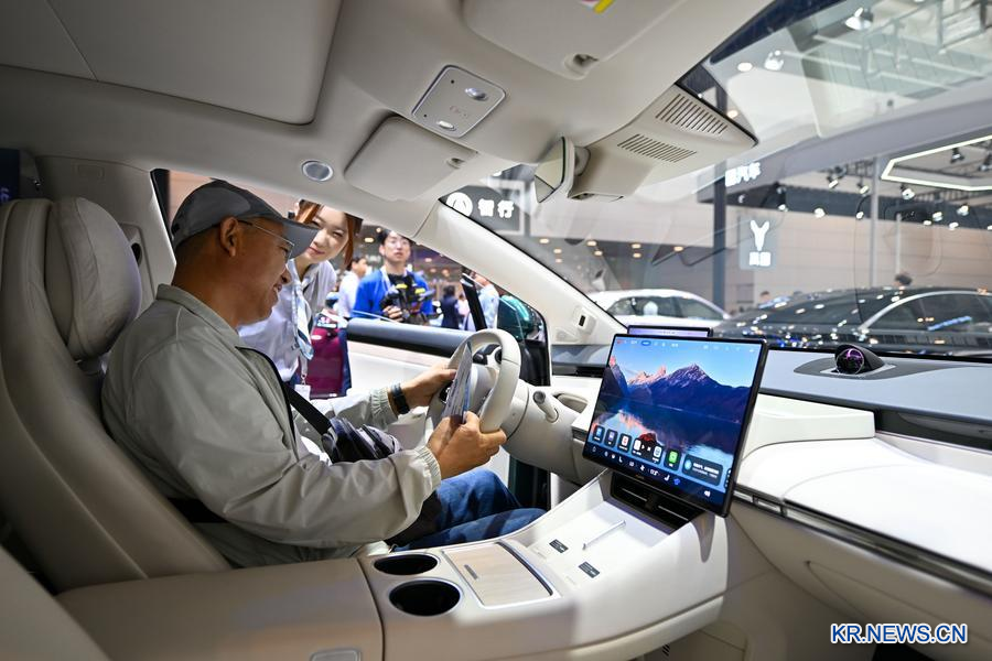 지난 9월 30일 '2025 중국(톈진·天津)국제모터쇼'에서 관람객이 스마트 주행 기능을 갖춘 자동차를 살펴보고 있다. (사진/신화통신)