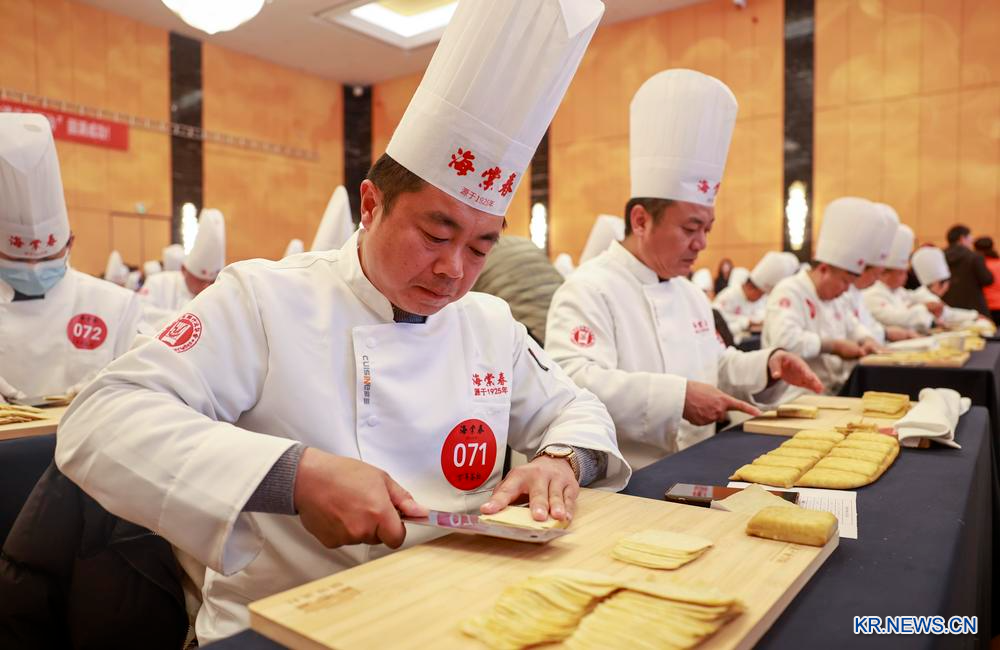 23일 타이저우(泰州) 짜오차(早茶) 무형문화유산 전승 행사에 참가한 셰프들이 현장에서 간쓰(乾絲·두부채)를 만들고 있다.