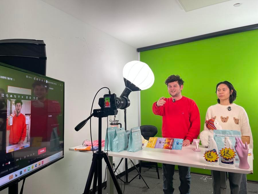 상하이 훙차오핀후이(虹橋品滙) 라이브커머스 기지에 들어서자 에티오피아 출신 진행자가 생두가 커피로 완성되는 전 과정을 직접 선보이고 있다.