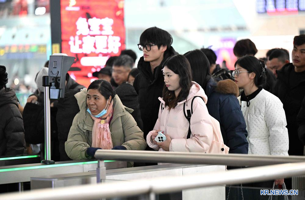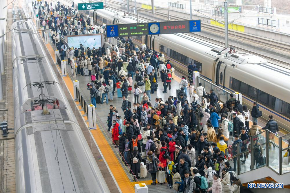 이날 허난(河南)성 뤄양(洛陽)시 룽먼(龍門)역에서 열차에 탑승하는 사람들. 2026.1.3