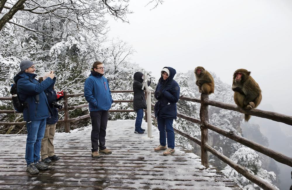 [신화망 베이징 1월4일] 2일 후난(湖南)성 장자제(張家界) 국가삼림공원을 찾은 외국인 관광객들이 황스자이(黃石寨) 관광지를 둘러보고 있다.