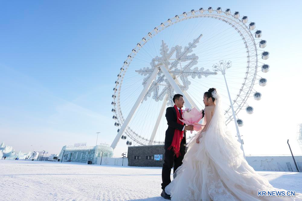 한 쌍의 신혼부부가 6일 하얼빈(哈爾濱) 빙설대세계 단지에서 포즈를 취하고 있다.
