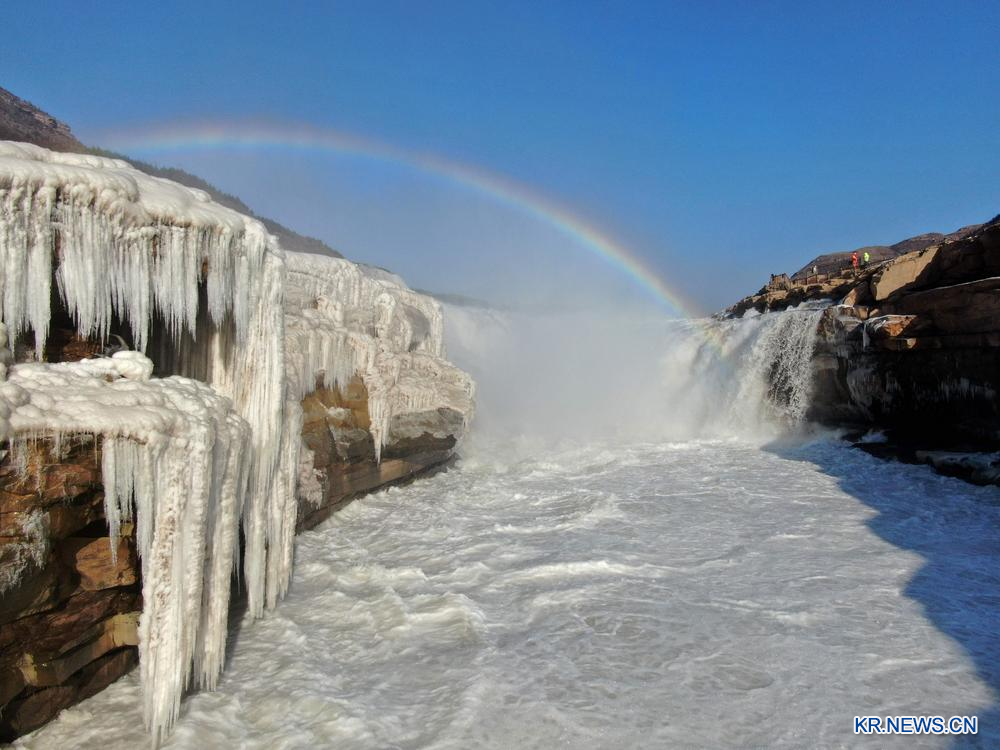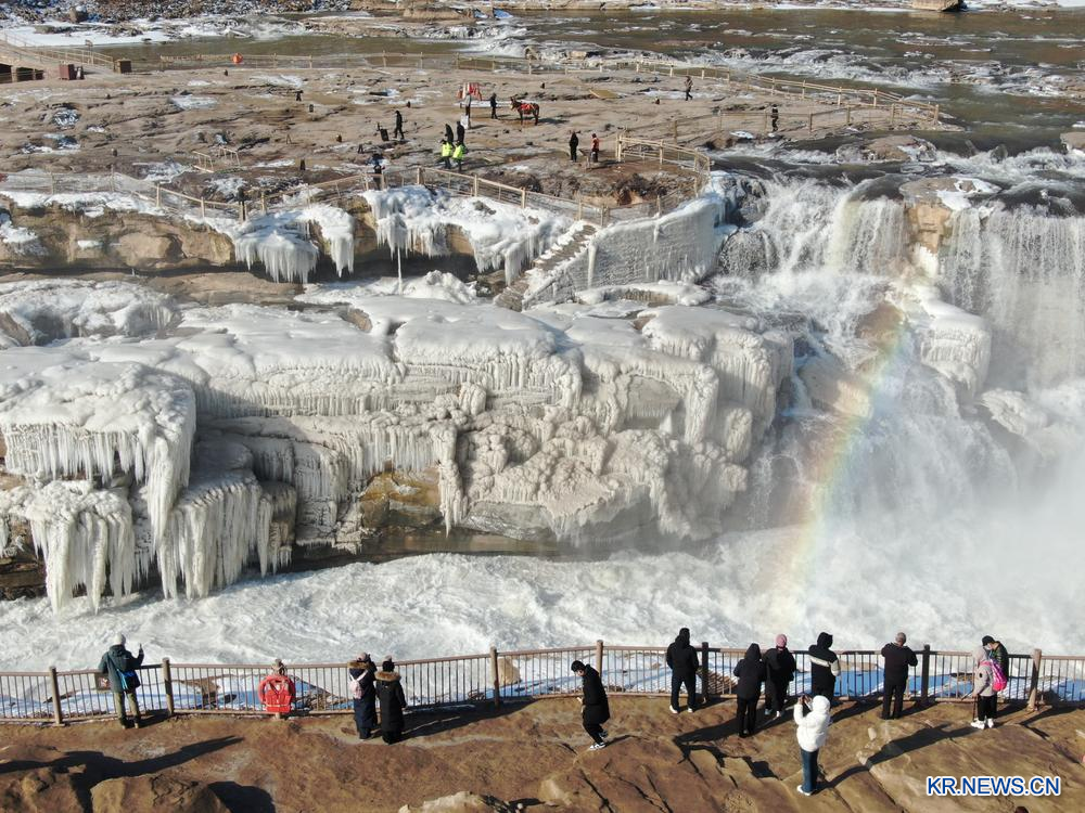 [신화망 지현 1월7일] 산시(山西)성 지(吉)현과 산시(陝西)성 이촨(宜川)현의 경계에 있는 황허(黃河) 후커우(壺口) 폭포 관광지가 겹겹이 쌓인 얼음과 무지개가 어우러져 그림 같은 경관을 자아냈다.