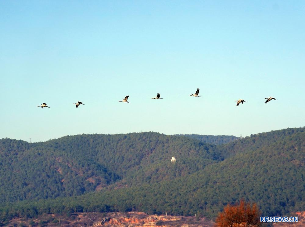 지난 6일 윈난(雲南)성 리장(麗江) 라스하이(拉市海) 자연보호구에서 노닐고 있는 철새들의 모습.