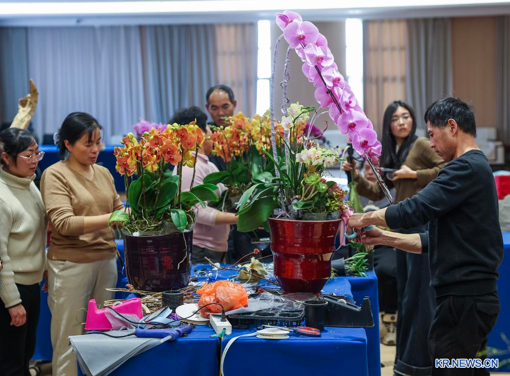 저장(浙江)성 진화(金華)시 진둥(金東)구 리푸(澧浦)화훼∙묘목성(城) 상인들이 8일 호접란 꽃꽂이를 배우고 있다.