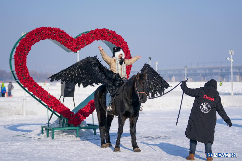 [신화망 하얼빈 1월12일] 11일 관광객이 쑹화(松花)강 하얼빈(哈爾濱) 구간에서 말 위에 올라 기념사진을 찍고 있다.