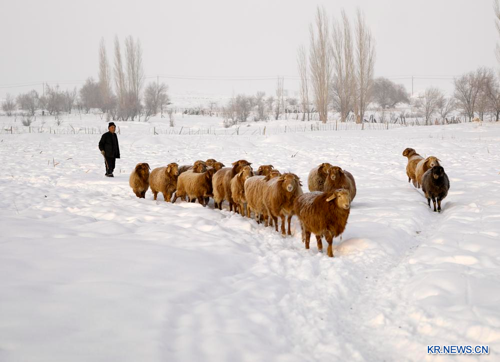 13일 아러타이시 쉐두(雪都)촌에서 한 목축민이 양 떼를 몰고 있다. 2026.1.13