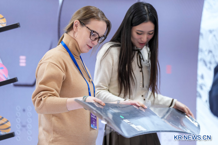 '2026 하얼빈(哈爾濱) 국제빙설경제박람회' 참가자(왼쪽)가 지난 6일 방문객에게 스마트 탄소섬유 스노보드의 성능을 소개하고 있다. (사진/신화통신)