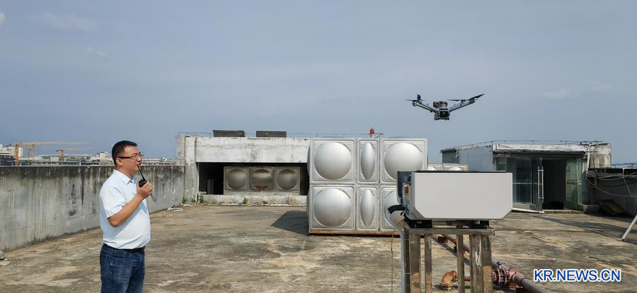 윈난(雲南)성 멍쯔(蒙自)시 도심의 한 건물 옥상에서 직원이 원격으로 드론을 조작하고 있다. (사진/신화통신)