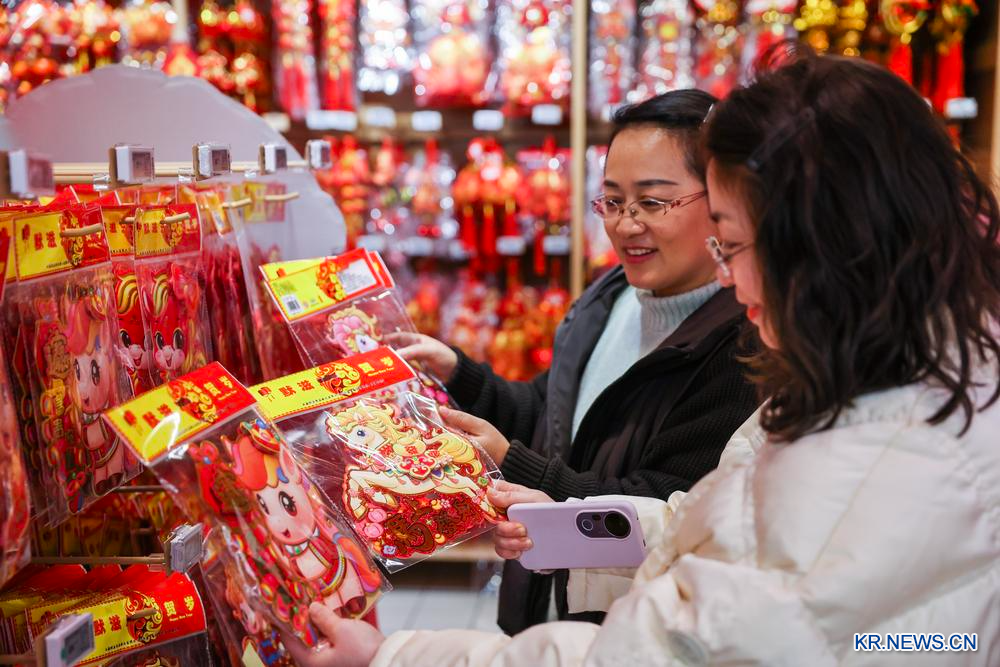 13일 저장(浙江)성 자싱(嘉興)시 난후(南湖)구의 한 마트에서 시민들이 말의 해를 맞아 말 모양의 장식품을 고르고 있다.