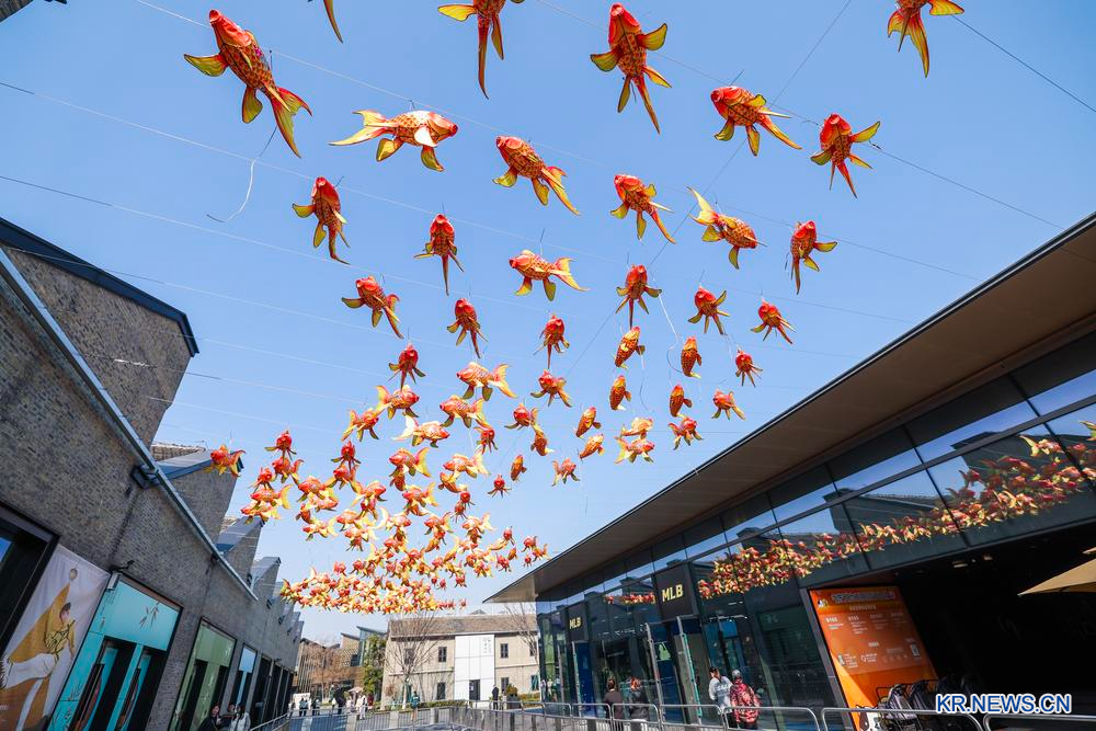 13일 자싱시 난후구의 한 상업거리에 설치된 형형색색의 물고기 모양 등불이 전통 명절의 분위기를 더하고 있다. 2026.1.13