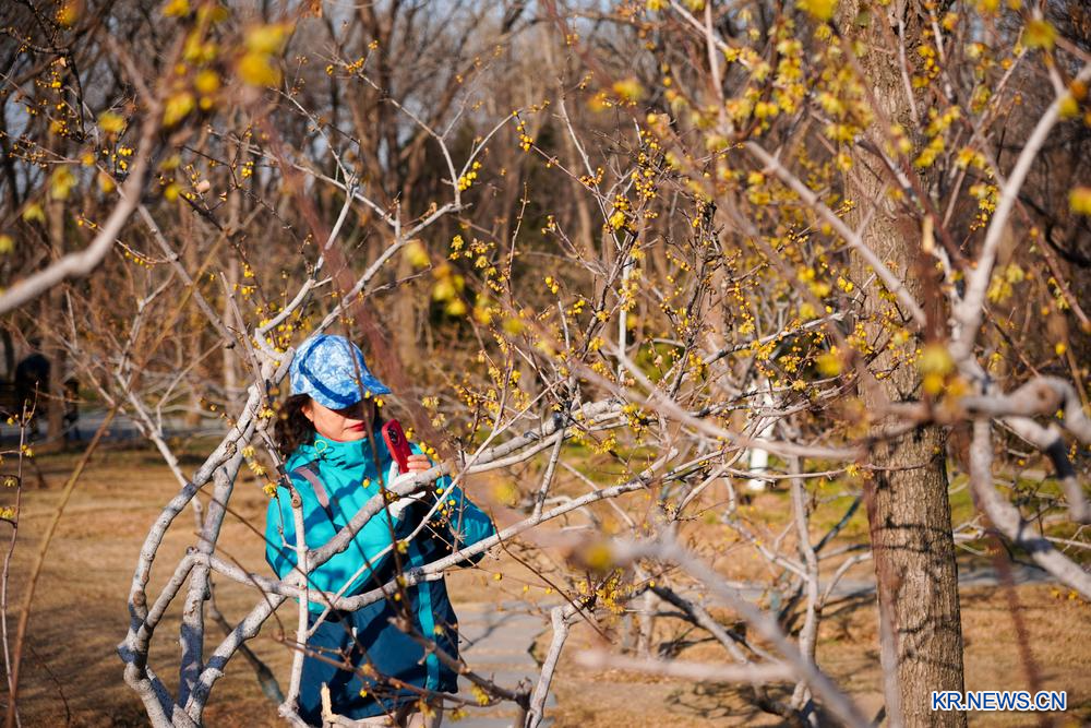 한 관광객이 13일 산둥(山東)성 지난(濟南)시 첸포산(千佛山)공원 납매단지에서 납매화를 카메라에 담고 있다.