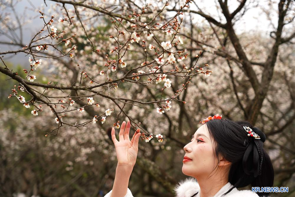 관광객이 18일 저장(浙江)성 항저우(杭州)시 차오산(超山) 관광지에서 매화를 감상하고 있다.
