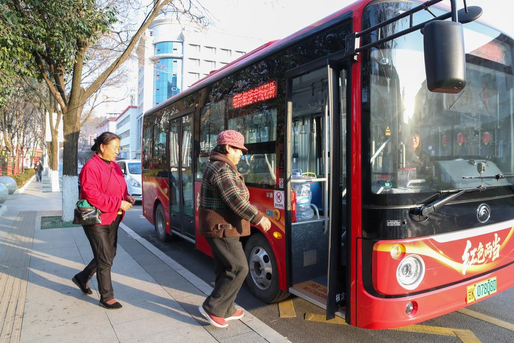 현지 주민이 지난 17일 간쑤(甘肅)성 룽난(隴南)시 량당(兩當)현의 한 정류장에서 무료 시내버스를 타고 있다.