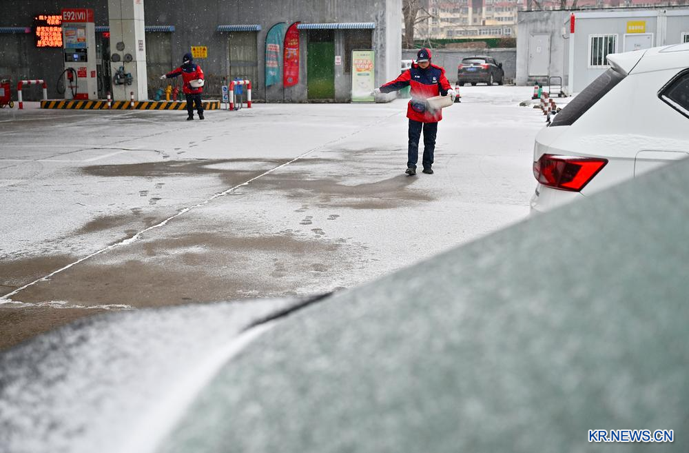 19일 허난(河南)성 상추(商丘)시의 한 주유소 직원이 염화칼슘을 뿌리며 제설 작업을 하고 있다.