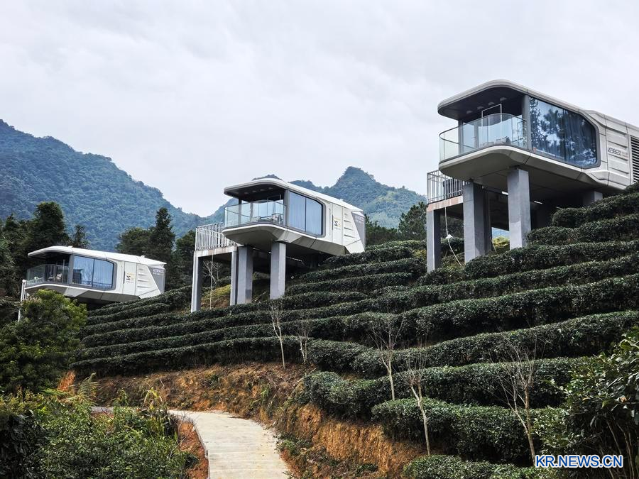 췌밍춘(鵲鳴春)유기농다원(茶園)은 차밭 위에 '떠 있는 듯' 설치된 여섯 채의 캡슐형 펜션이 이색적인 풍경을 연출한다. 숙소의 통유리창으로 밖을 바라보면 발 아래엔 차밭이 물결치듯 이어지고 멀리 산 능선이 펼쳐진다.