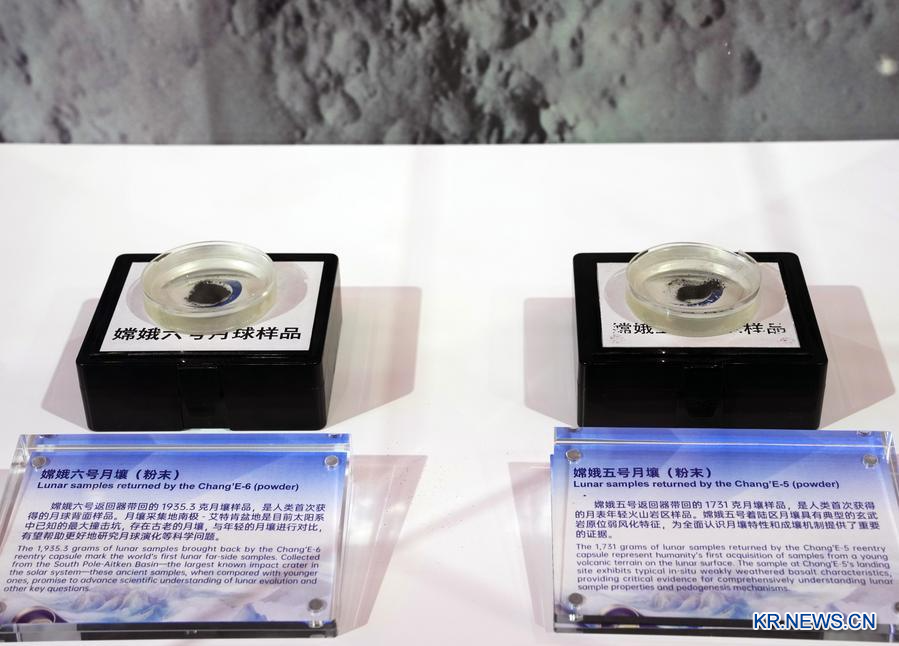 2025년 11월 5일 제8회 중국국제수입박람회(CIIE)' 중국관에 전시된 창어(嫦娥) 5호, 6호가 달 표면에서 채취한 토양. (사진/신화통신)