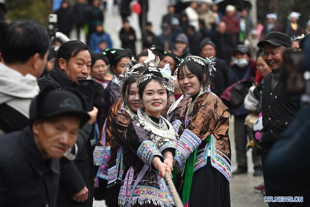 이날 줄다리기 대회에 참가한 먀오족 여성들. 2026.1.20