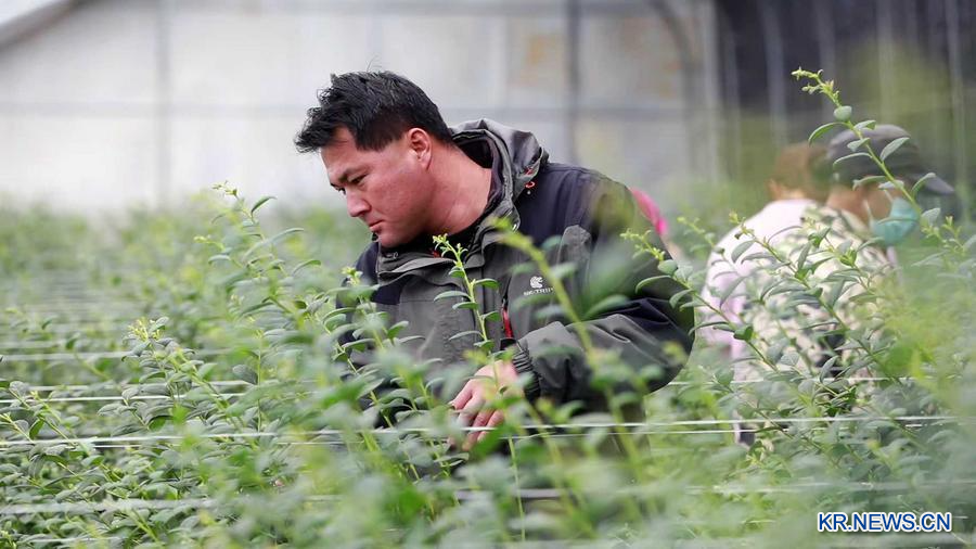 8일 딩시시 안딩구의 한 시설채소 비닐하우스에서 기술자가 블루베리 생장 상태를 살펴보고 있다. (사진/신화통신)