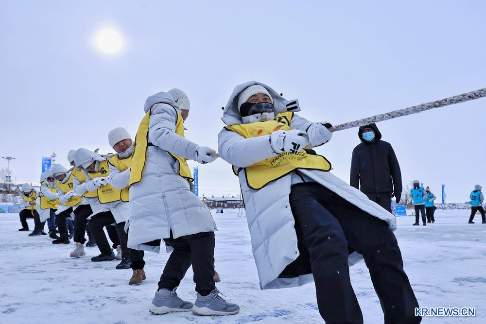 허저(赫哲)족 주민들이 23일 허저족향 겨울 고기잡이 행사장에서 줄다리기를 하고 있다.