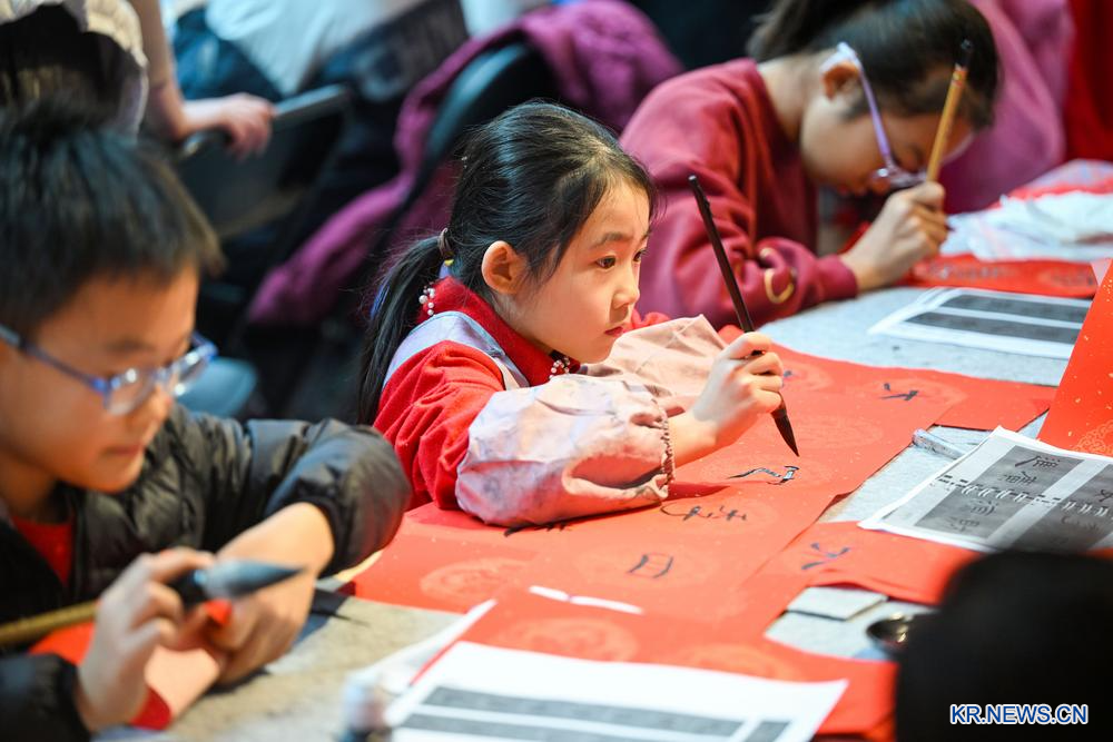 어린이들이 24일 톈진(天津)시 소년아동활동센터에서 춘련(春聯·춘절에 문이나 기둥에 붙이는 주련)을 쓰고 있다.