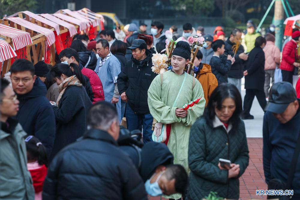[신화망 항저우 1월25일] 저장(浙江)성 항저우(杭州)시 문화관 등이 공동 주최한 '2026 항저우 무형문화유산 춘절맞이 용품 시장'이 24일 개장했다. 전통과 현대적 요소가 조화를 이루며 흥겨운 분위기를 연출했다.