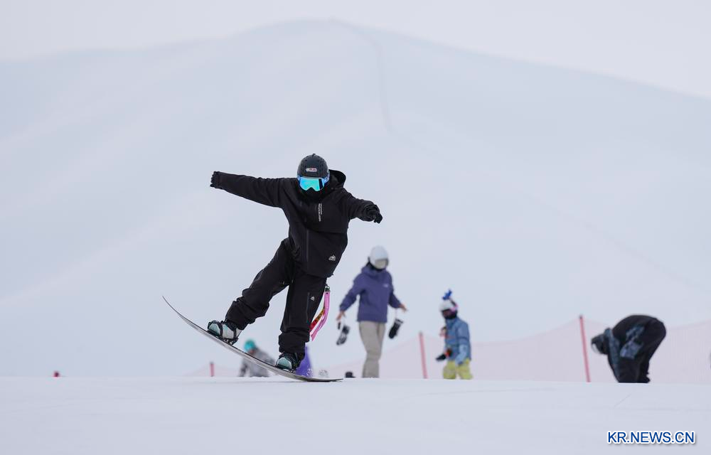 [신화망 중국 이리 1월27일] 25일 스키 애호가들이 신장(新疆)위구르자치구 나라티(那拉提) 하인싸이(哈茵賽) 스키 리조트에서 스노보드를 타고 있다.