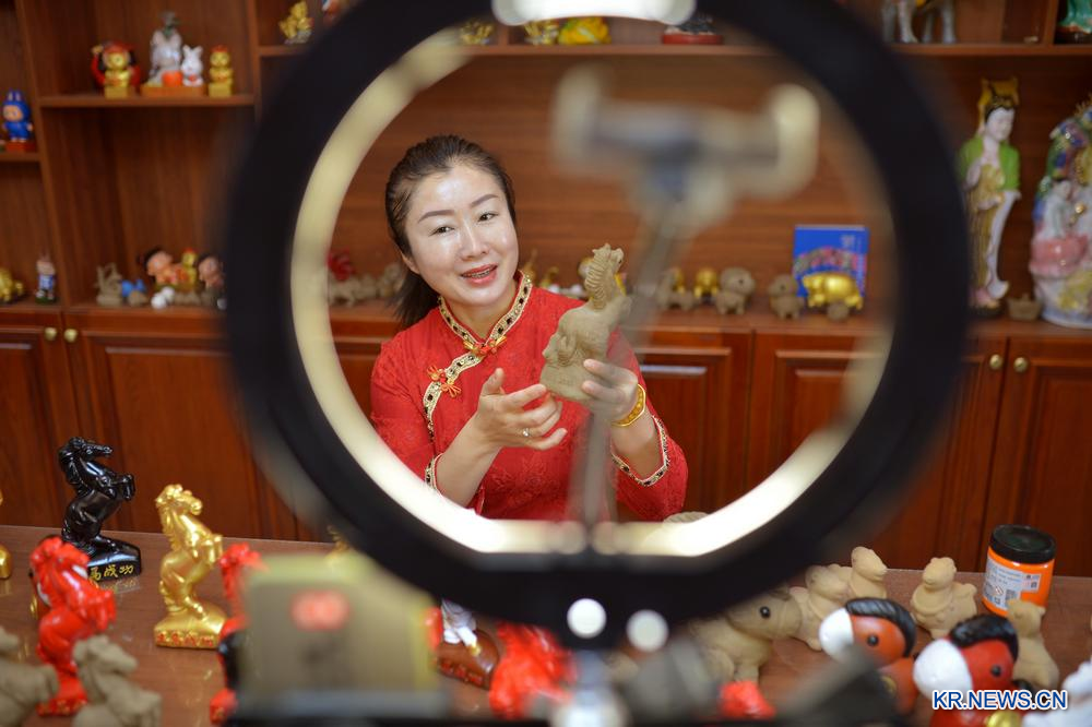 21일 산둥성 칭다오(靑島)시 청양(城陽)구에 위치한 한 흙인형 무형문화유산 공방에서 라이브 방송 중인 수공예 장인. 2026.1.27
