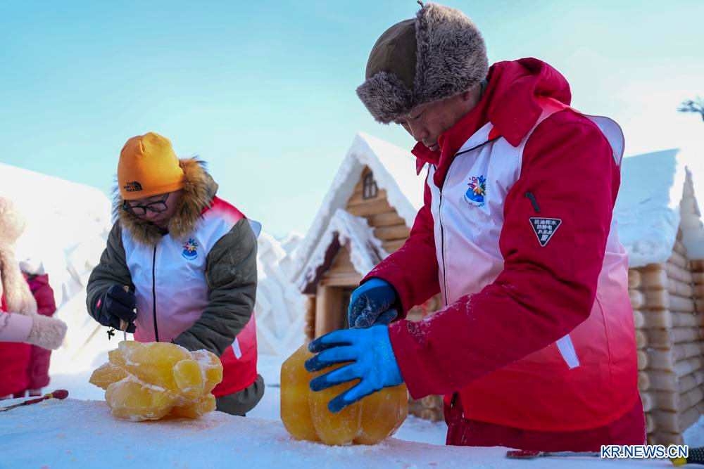 얼음 조각가들이 28일 '제27회 하얼빈(哈爾濱) 빙설대세계' 단지에서 식물로 색을 입힌 얼음을 사용해 조각품을 창작하고 있다.