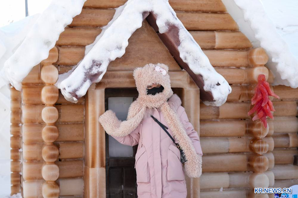 참관객이 28일 '제27회 하얼빈 빙설대세계' 단지에 만들어진 식물 채색 얼음 조각집에서 기념사진을 찍고 있다. 2026.1.28