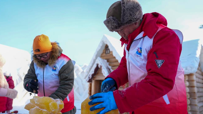 28일 '타오쉐(淘學) 펭귄'이 헤이룽장(黑龍江)성 이춘(伊春)시의 눈밭 위에서 관객들에게 즐거움을 주고 있다.