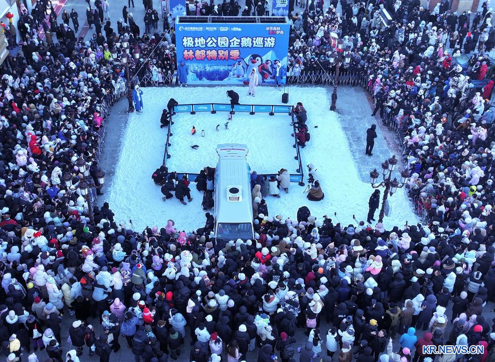 [신화망 중국 이춘 1월30일] 헤이룽장(黑龍江)성 하얼빈(哈爾濱) 극지공원에서 온 '타오쉐(淘學) 펭귄'이 '숲의 도시'인 이춘(伊春)시를 순회하며 많은 시민과 관광객을 끌어모았다.