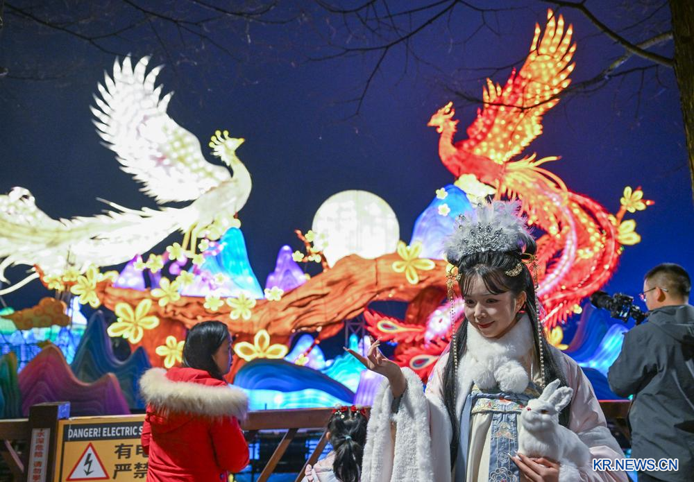 [신화망 충칭 2월1일] 30일 충칭(重慶)시 위안보위안(園博園) 대형 수상 등회 현장에서 직원(앞 오른쪽)이 여행객과 상호작용을 하고 있다.