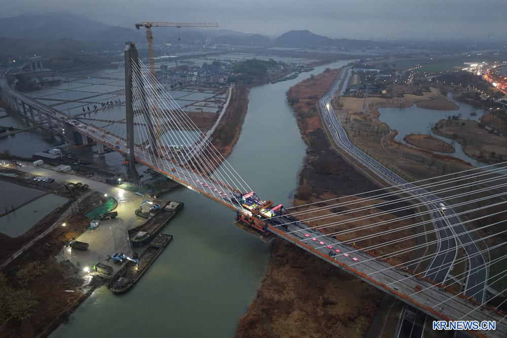 [신화망 항저우 2월1일] 저장(浙江)성 항저우(杭州)와 더칭(德淸)을 연결하는 시역(市域)철도 둥탸오시(東苕溪) 현수교가 30일 저녁 순조롭게 연결됐다. 이로써 전 노선 교량 본체 공사가 모두 완료됐다.