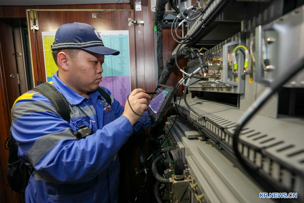 춘윈(春運·춘절 특별 수송)을 대비해 중국철로 하얼빈(哈爾濱)국그룹 직원들이 30여 대 고속열차의 열차자동방호장치(ATP)에 대한 점검과 고장 처리 작업을 수행하고 있다.