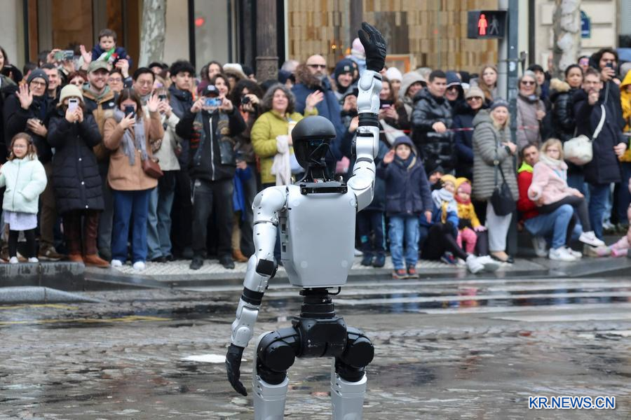 파리 샹젤리제 거리에서 한 로봇이 약 800명으로 이루어진 공연자 행렬 맨 앞에서 천천히 걸어간다. 이내 음악에 맞춰 방향을 틀다가 잠시 멈춰 관중에게 손을 흔들어 보인다. 그 모습에 관중들은 환호하며 스마트폰을 들어 올린다.