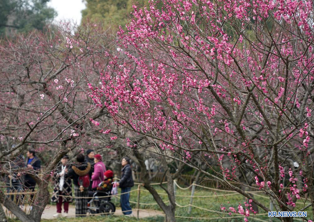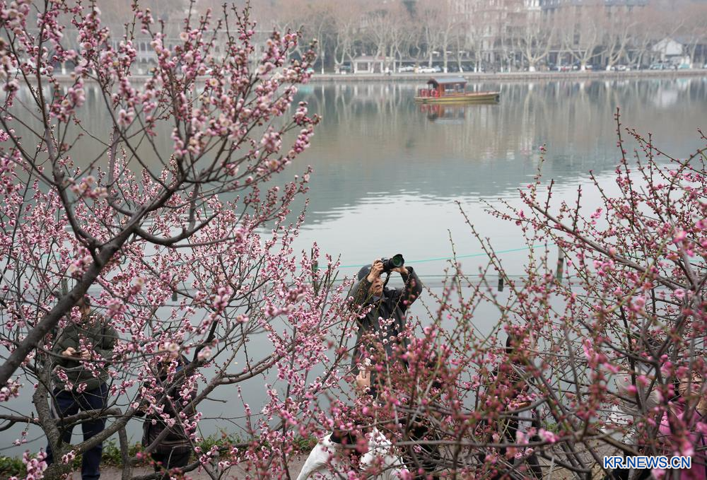 [신화망 항저우 2월5일] 4일 관광객이 저장(浙江)성 항저우(杭州)시 시후(西湖)관광지 구산(孤山) 매화원에서 꽃놀이를 즐기고 있다.