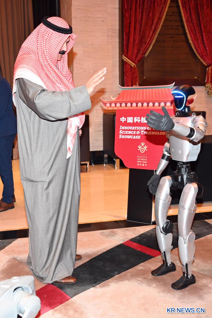 쿠웨이트 알파르와니야주에서 열린 '즐거운 춘절' 문화 행사에서 한 남성이 로봇과 손인사를 하고 있다. 2026.2.3